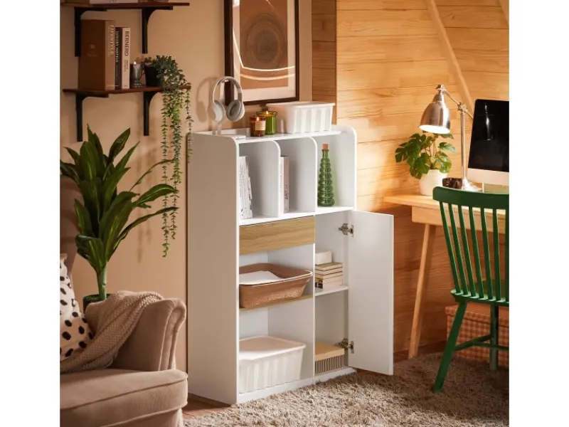 Das moderne Design mit weißen Oberflächen und akzentuierenden Holzelementen verleiht dem Regal einen frischen und eleganten Look, der sich nahtlos in jede Umgebung einfügt.
