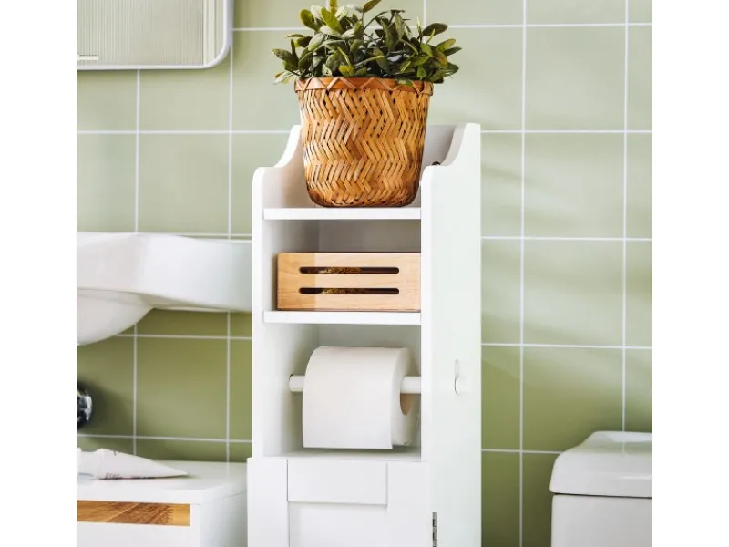 Der schmale Toilettenpapier Schrank ist das ideale Möbel für Nischen oder kleine Bäder.