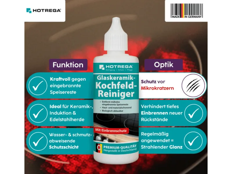 Kochfeld-Reiniger: Entfernt Eingebranntes, Fett und Rückstände auf Glaskeramik- und Induktionskochfeldern.