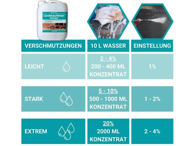 Je nach Verschmutzungsgrad lässt sich der Reiniger flexibel dosieren. Er kann sowohl manuell als auch mit einem Hochdruckreiniger verarbeitet werden. Nach der Reinigung wird ein Nachspülen mit klarem Wasser empfohlen. Starke Verschmutzungen auf Fahrzeugen und Geräten: 20 %, d. h. 2 l Konzentrat auf 10 l Wasser (manuelle Reinigung) / 2 – 4 % (Hochdruckreiniger) Oberflächen- und Fußbodenreinigung in Stallungen (mittlere bis starke Verschmutzungen): 5 – 10 %, d. h. 0,5 – 1 l Konzentrat auf 10 l Wasser (manuelle Reinigung) / 1 – 2 % (Hochdruckreiniger) Unterhaltsreinigung im Haushalt oder bei leichten Verschmutzungen: 2 – 4 %, d. h. 200 – 400 ml Konzentrat auf 10 l Wasser (manuelle Reinigung) / 1 % (Hochdruckreiniger)