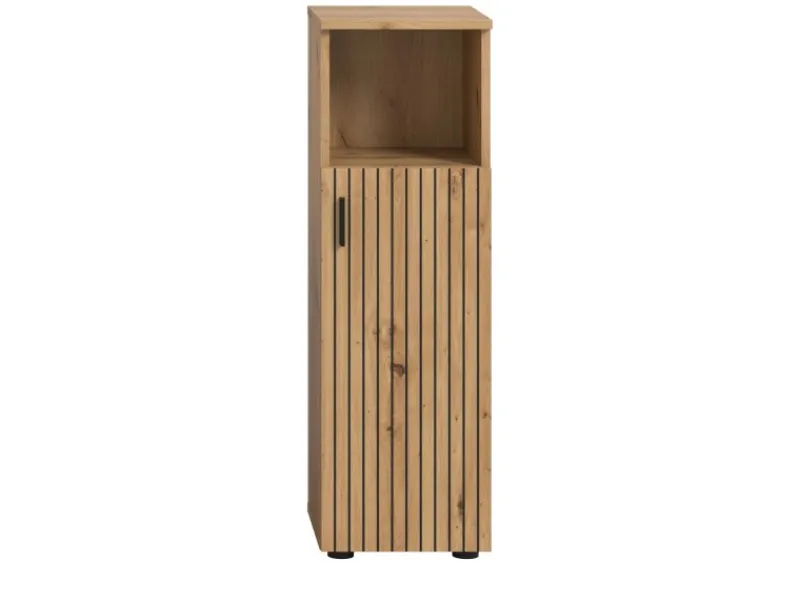 Die Badezimmer Kommode „Livia“ von Inn.Furn überzeugt mit modernem Design in Artisan Eiche Dekor und eleganter Leistenoptik. Mit zwei geschlossenen Fächern und einem offenen Fach bietet sie praktischen Stauraum und Platz für dekorative Elemente. Schwarze Griffleiste und kompakte Maße machen sie ideal für kleine und große Bäder.