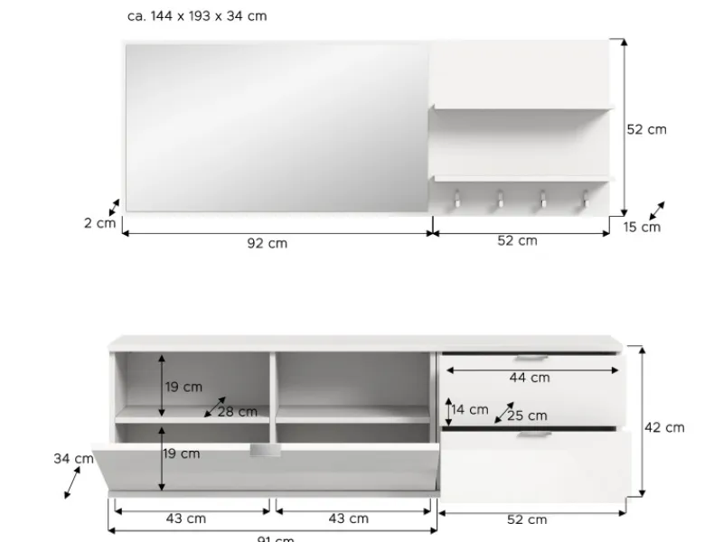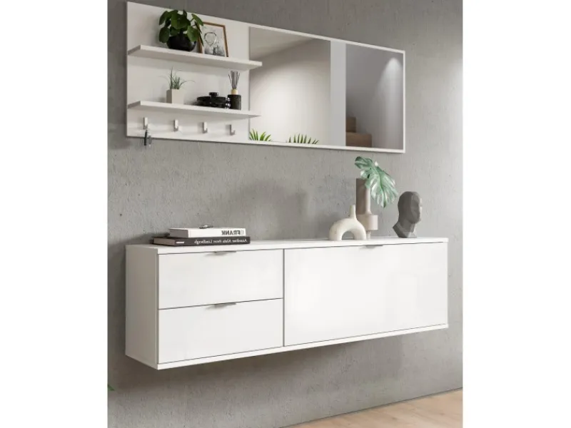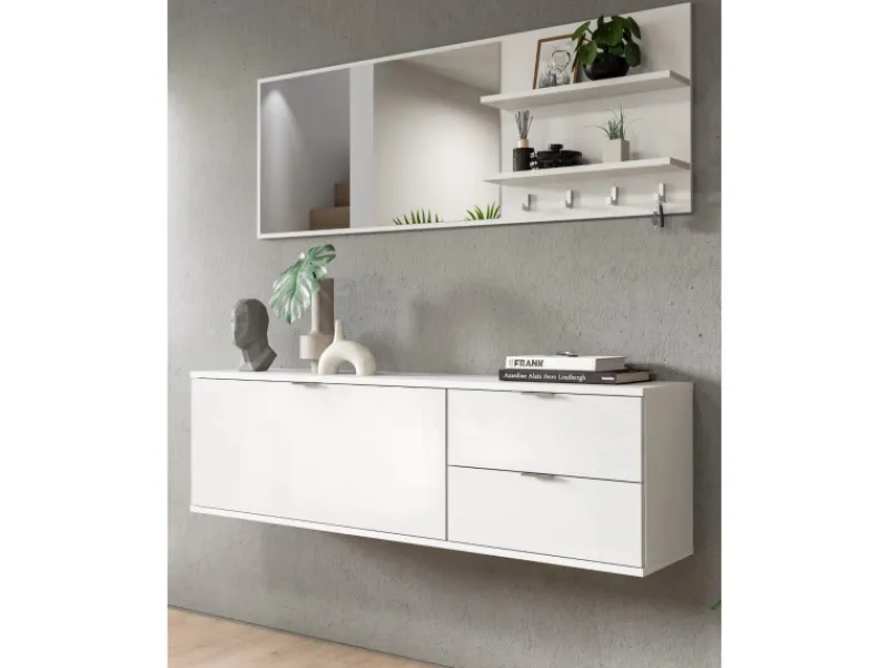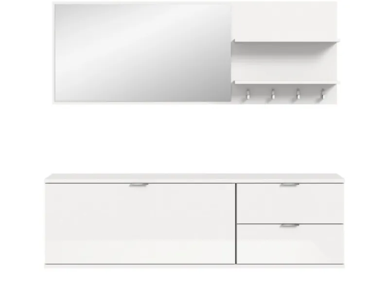 Das elegante Garderoben Set „SystemX“, bestehend aus vier hochwertigen Komponenten, die Funktionalität und Stil vereinen, wird Sie begeistern. Dieses Set enthält einen Wandspiegel, eine Kommode, ein Wandregal sowie eine Schubladenkommode, alles in einem modernen Design mit weißer Hochglanzfront und weißem Korpus. Mit den Maßen von nur 144 x 193 x 34 cm bietet „SystemX“ ausreichend Stauraum: zwei Schubkästen, vier geschlossene Fächer, zwei Regalböden und vier Kleiderhaken sorgen für Ordnung in Ihrem Eingangsbereich. Das 4-teilige Set kann vollständig hängend genutzt werden, was zusätzlichen Platz auf dem Boden schafft.