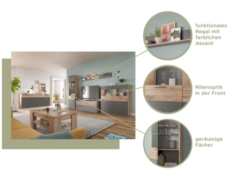 – Einzelmöbeln mit verschiedenen Stell- und Kombinationsmöglichkeiten