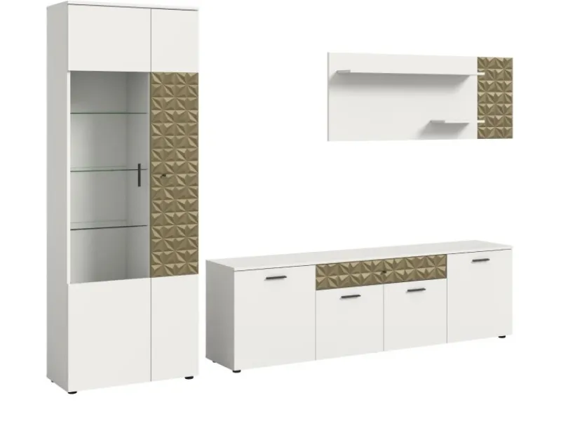Die Wohnwand Relief in Weiß und Gold umfasst eine Vitrine, ein Wandboard und ein TV-Lowboard.