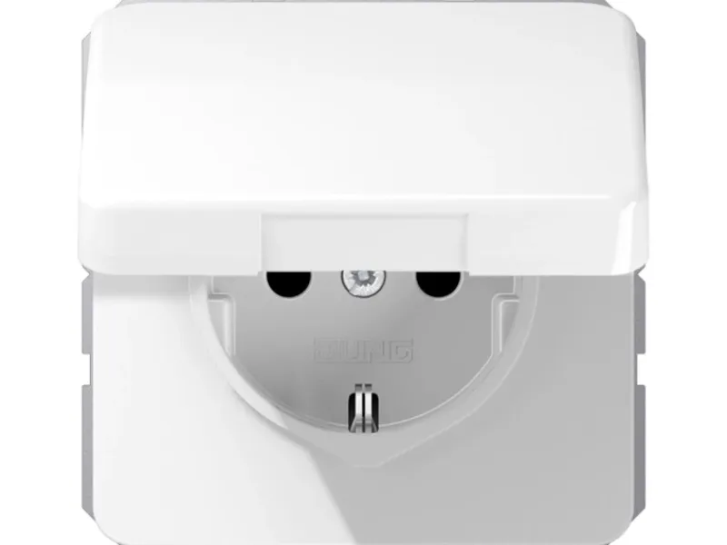 Der Jung Steckdoseneinsatz aus Thermoplast (bruchsicher) hochglänzend mit Klappdeckel (mit Rückstellfeder) und integriertem erhöhten Berührungsschutz sowie Federklemmen ist für starre und unbehandelte flexible Leiter bis 2,5 mm². Verbindungsklemmen nach DIN VDE 0620 ohne Befestigungskralle. Tragring, Krallen und Krallenschrauben sind über eine Erdungsschiene in die Schutzmaßnahme eingebunden