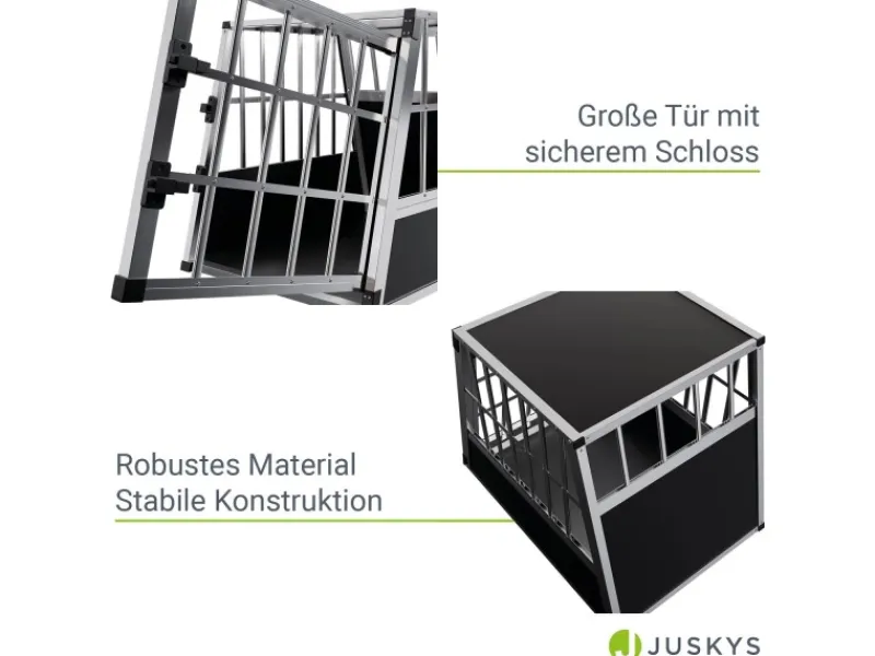 Die rostfreie Reisebox ist aus furnierten MDF-Holzplatten und Aluminiumgitter gefertigt. Diese Kombination sichert erstklassige Stabilität und eine lange Lebensdauer. Zugleich können Sie sie dank des geringen Gewichts ohne Anstrengung aus dem Kofferraum heben. Die Tür lässt sich mithilfe eines Schlosses sicher verschließen.
