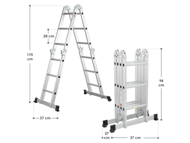 Die Gelenkleiter trägt bis zu 150 kg Gewicht. Gummierte Standfüße bieten einen festen Stand. Breite Treppenstufen mit Anti-Rutschprofil verhindern das Abrutschen und sorgen für einen sicheren Halt. Das Gelenksystem mit Sicherheitsverriegelung verleiht der Multifunktionsleiter Stabilität.