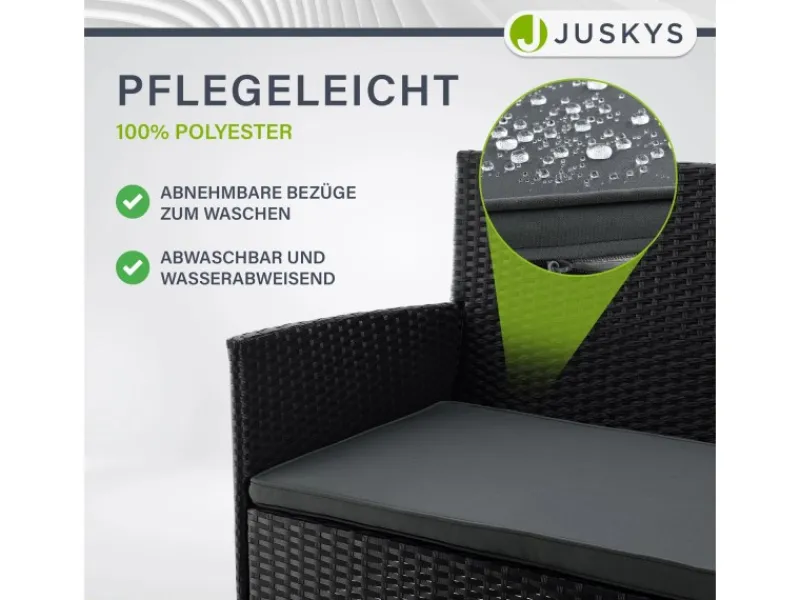 Polyrattan ist ideal für Outdoor, da das Geflecht wetterfest, strapazierfähig und langlebig ist. Die hohe Elastizität ermöglicht ein angenehmes Sitzen auch ohne Kissen. Es trotzt Hitze, UV-Strahlung und Regen. Bei Schmutz lässt sich die Sitzgarnitur leicht mit einem feuchten Tuch reinigen.