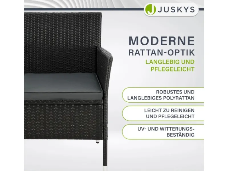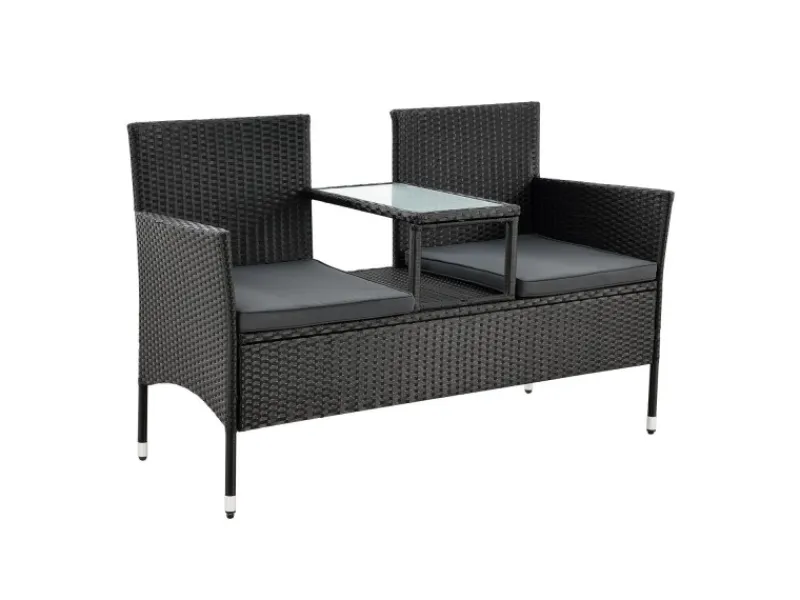 Ausgestattet mit weichen Polstern sowie hohen Arm- und Rückenlehnen bietet die Sitzgarnitur einen perfekten Komfort. Zwischen den zwei Plätzen befindet sich ein kleiner Abstelltisch mit einer 5 mm stabilen Glasplatte. Hier platzieren Sie ein kühles Getränk an einem warmen Sommertag.