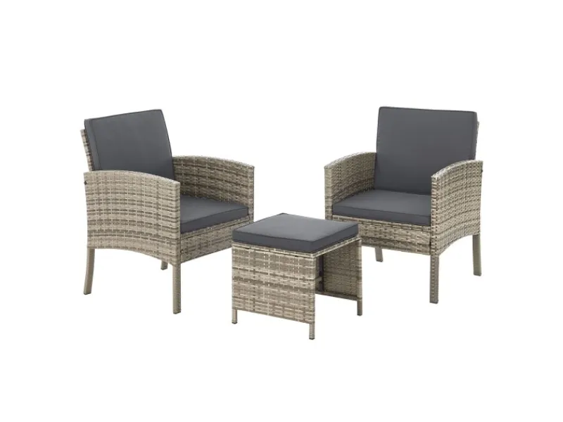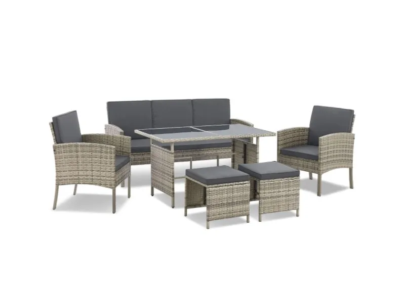 Die 3-Sitzer Bank und die zwei Stühle der Garnitur bieten genug Platz für Sie und Ihre Gäste. Die zwei Hocker runden das Set ab – perfekt zum Füßehochlegen.