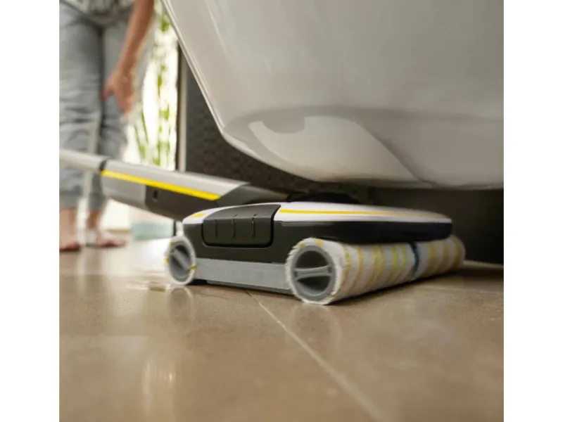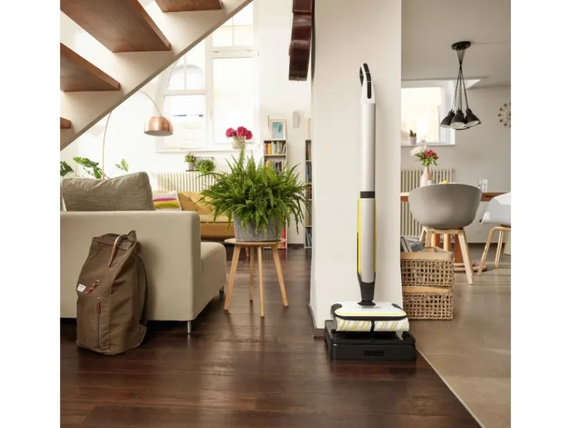Der FC 7 kann von selbst stehen, sodass du auch kurze Pausen einlegen kannst. Dank des flexiblen Gelenks gelingt auch das Wischen unter Möbeln mühelos. Die praktische Reinigungsstation erleichtert dir die Entnahme und Trocknung der Walzen und bietet zudem eine praktische Aufbewahrung für Zubehöre. Die Akkus lassen sich austauschen und können auch für andere 4 V Battery Power-Geräte von Kärcher eingesetzt werden.