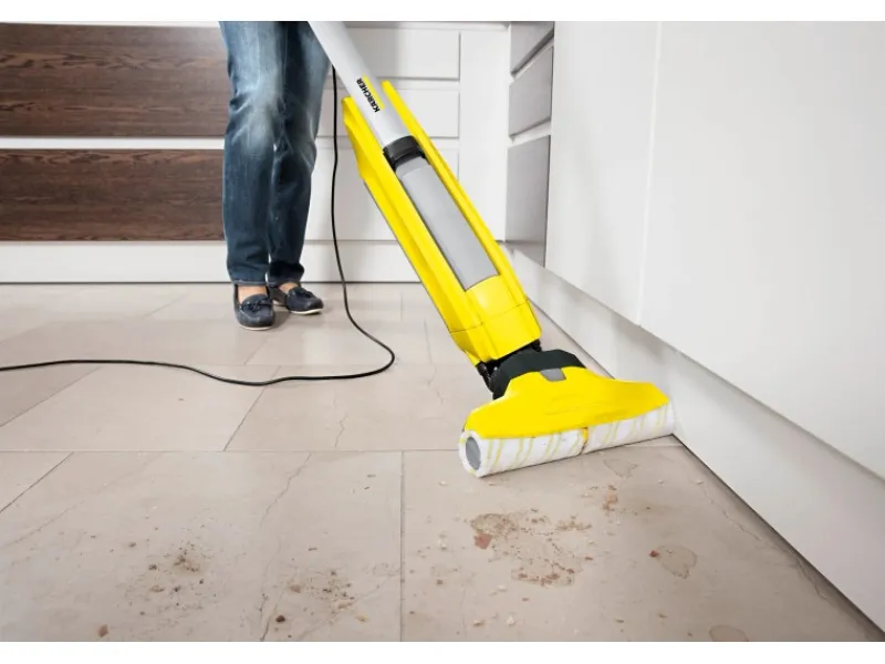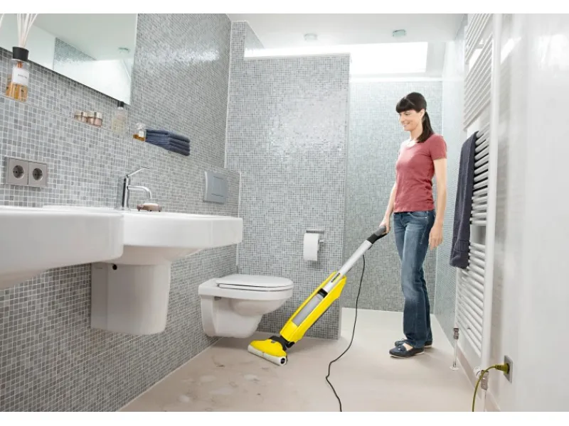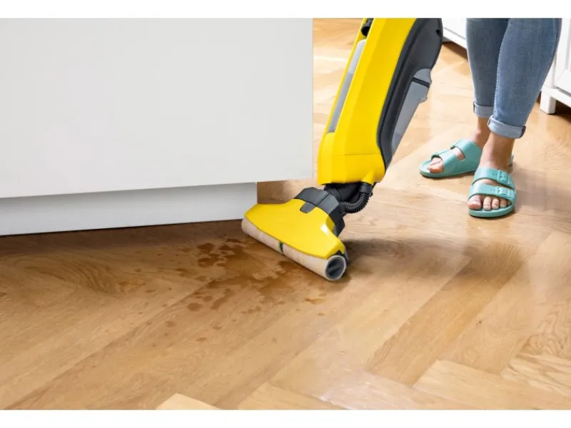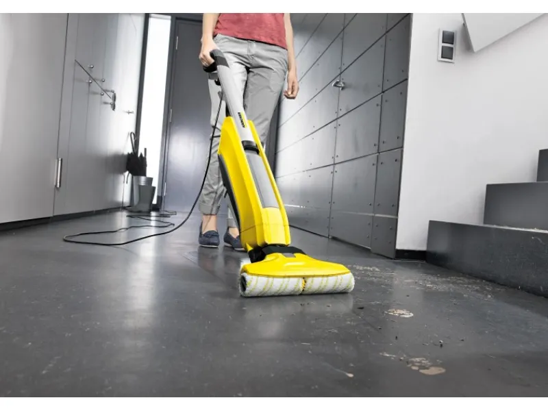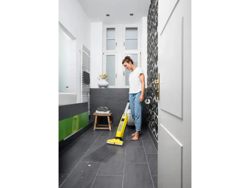 Bevor Sie mit dem Kärcher FC 5 die Reinigung starten, sollten Sie Ihre Böden vom gröbsten Schmutz entfernen. Anschließend entnehmen Sie den Frischwassertank und befüllen diesen unter dem Wasserhahn bis zur maximalen Markierung. Danach können Sie Reinigungsmittel hinzugeben. Die Walzen werden vorher für etwa 5 Sekunden mit 50 ml Wasser in der Reinigungsstation befeuchtet. Jetzt können Sie auch schon loslegen. Arbeiten Sie am besten rückwärts in Richtung Tür. Nach der Reinigung entnehmen Sie den Schmutzwassertank entleeren und reinigen ihn. Die Walzen können mit 200 ml Wasser für 30 bis 60 Sekunden in der Station vorgespült werden. Die Saugkopfabdeckung können Sie auch unkompliziert im Waschbecken abspülen und anschließend wieder am Gerät anbringen.