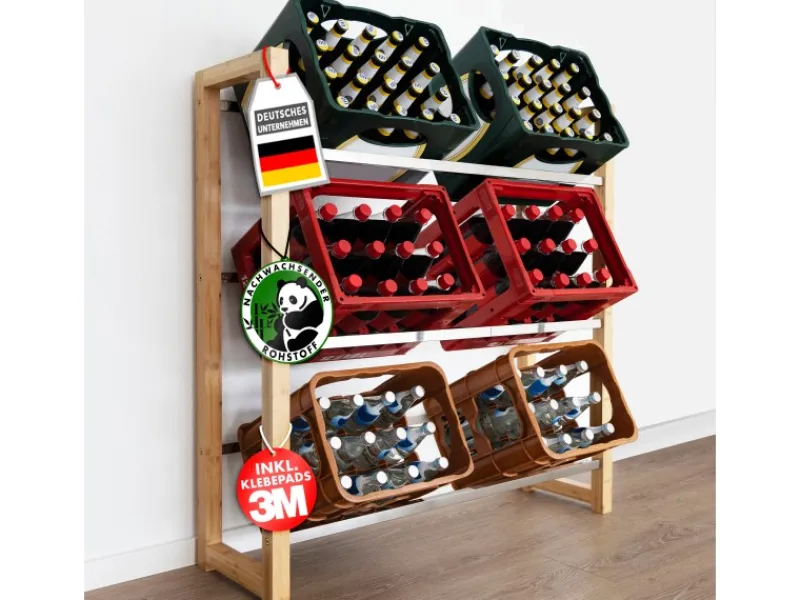 Zusammenfassend bietet der Bambus-Flaschenkastenständer Flash ein vielseitiges und robustes Lagersystem, das sich ideal für die Aufbewahrung von Getränkekästen, Wäscheboxen und vielen anderen Gegenständen eignet. Mit seinem ansprechenden Design, der einfachen Montage und der hohen Tragfähigkeit ist er die perfekte Lösung für alle, die Wert auf Ordnung, Stabilität und Ästhetik legen.