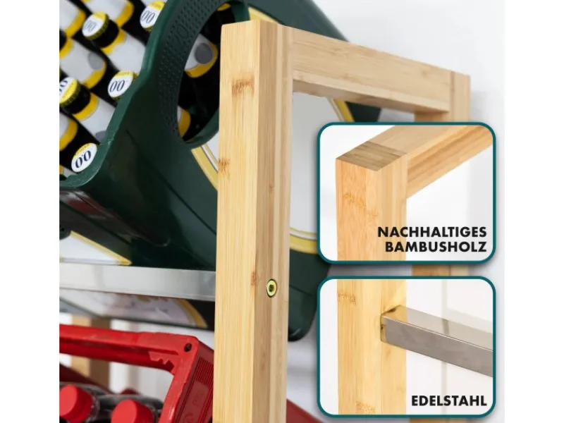 Der Flaschenkastenständer ist aus hochwertigem Bambus gefertigt, einem robusten Material, das sich durch seine Schönheit und Langlebigkeit auszeichnet. Die Verwendung von Edelstahl für die Verbindungselemente sorgt für zusätzliche Stabilität und Langlebigkeit des Ständers.