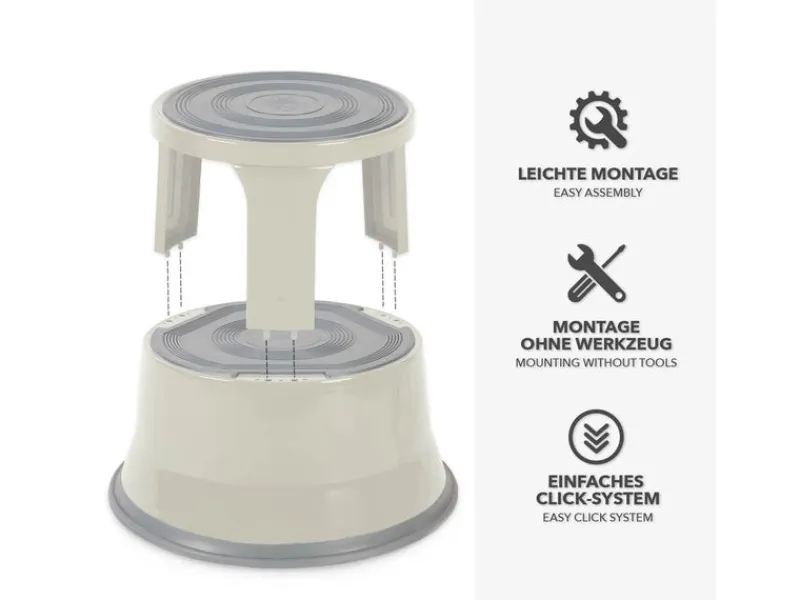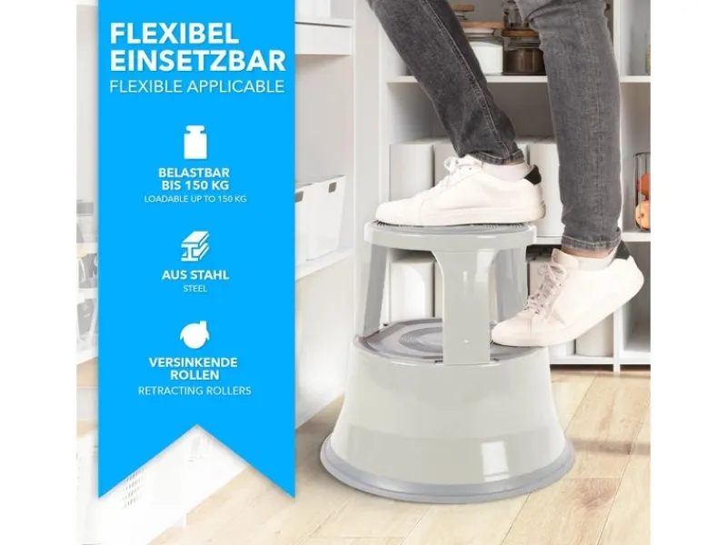 Ausgestattet mit Auflagen aus rutschhemmendem Gummi, bieten die beiden Stufen guten Halt beim Stehen. Sobald der Rollhocker mit Gewicht belastet wird, werden die gefederten Laufrollen nach innen gedrückt und der Tritthocker steht fest und sicher auf dem Boden.