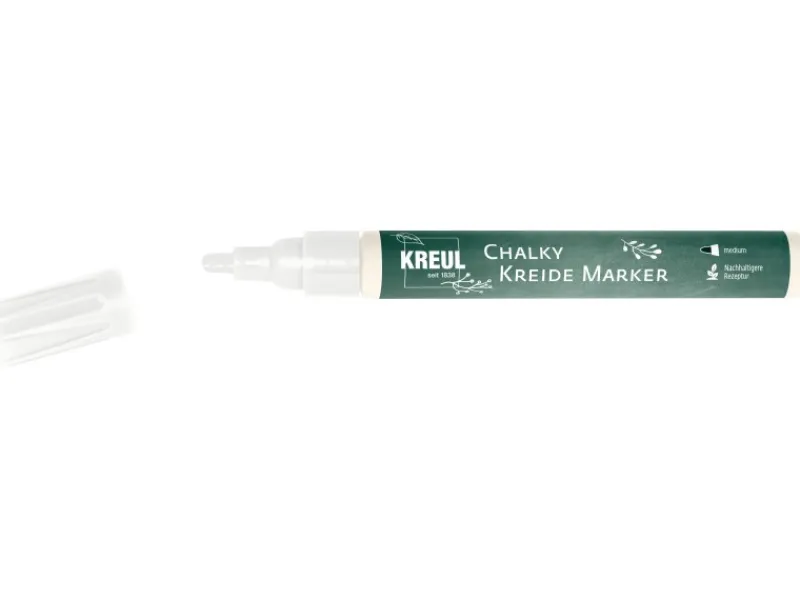 Der Kreul Kreidemarker ist Schreibwerkzeug aus Wasserbasis und kann bei Bedarf mithilfe des Nachfüll-Pens wieder aufgefüllt werden. Die Rezeptur besteht zu 60 % aus nachhaltigen Rohstoffen und der Kunststoff des Markers besteht zu 70 % aus recyceltem Kunststoff.