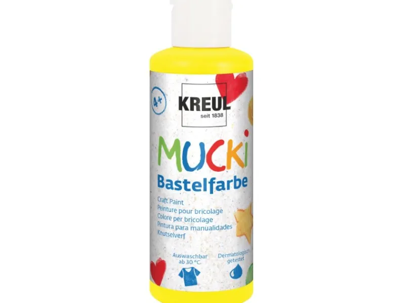 Ein Gemälde für Oma, ein Schatzkästchen für Mama oder ein Werkzeugkoffer für Papa. Wenn Selbstgebasteltes aus Papier, Karton, Keilrahmen, Holz, Stein, Terrakotta, Modelliermasse oder Glas bunt werden soll, dann ist die Mucki Bastelfarbe die richtige Wahl. Sie ist sofort einsatzbereit, mit dem Pinsel leicht verstreichbar und trocknet matt deckend auf. Spannende Techniken wie die Abklatschtechnik, Stempeln und Drucken, Schablonieren und Murmeln machen mit der Bastelfarbe aus dem Hause Kreul besonders viel Spaß. Sollte ein Klecks Farbe daneben gehen, ist das nicht schlimm: Mucki Bastelfarbe ist leicht von der Haut abwaschbar und lässt sich aus den meisten Textilien ab 30 °C gut auswaschen.