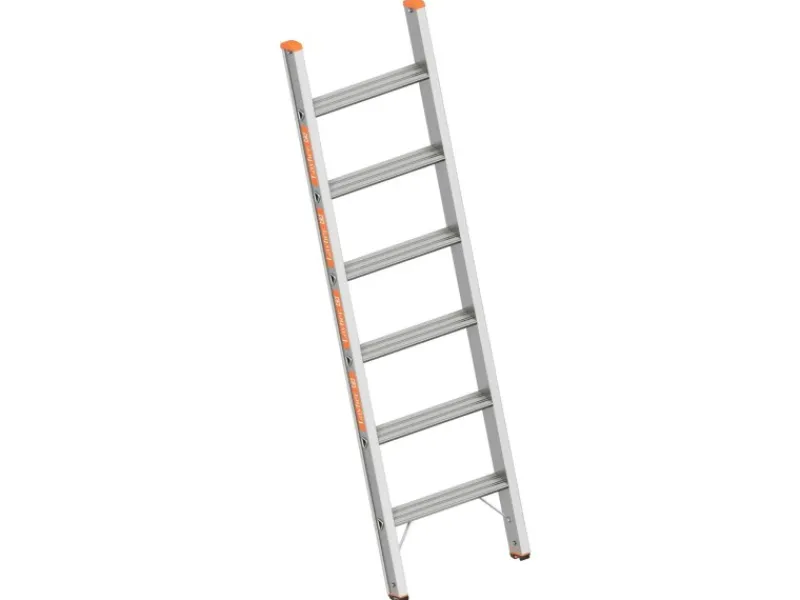 Anlegeleiter mit Stufen für eine breitere und längere Standfläche. Einfach im Gebrauch, höchstmögliche Sicherheit durch rutschhemmende Kunststoffschuhe.