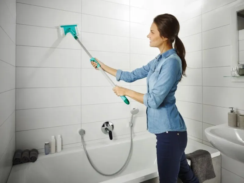 Bei schwer zugänglichen Stellen kommt der Teleskopstiel zum Einsatz, der sich auf eine Arbeitslänge von 75 cm bis 120 cm ausziehen lässt. Mit diesem Fliesen- und Wannenwischer können Sie selbst die hintersten Ecken von hartnäckigem Schmutz befreien und Ihrem Bad einen neuen Glanz verleihen.