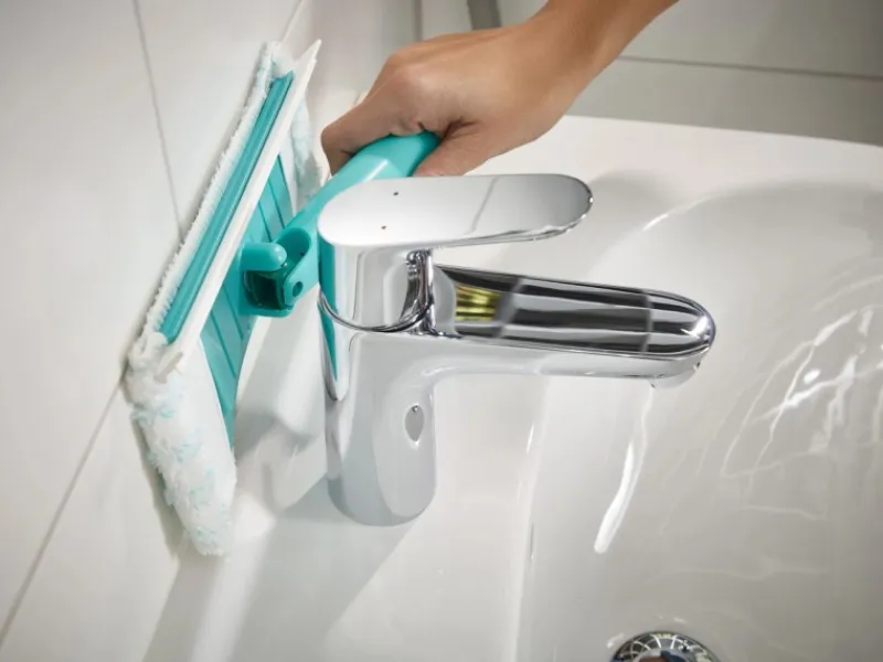 Seine runden Aussparungen passen sich exakt den Armaturen an und hässliche Schmutzränder werden so zuverlässig und bequem entfernt. Mit Hilfe des rundum beweglichen Gelenks lässt sich der Wannen- und Fliesenwischer problemlos in jede Ecke und Kante führen. Seine integrierte Abziehlippe sorgt nach dem feuchten Wischen für streifenfreien Glanz.