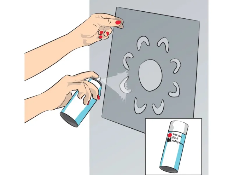 Der Malgrund muss sauber, fettfrei und trocken sein. Sprühen Sie die Schablone mit dem Marabu Schablonen-Haftspray aus einer Entfernung von ca. 30 cm ein. Achten Sie auf gleichmäßiges auftragen. Bei zu starker Nässe, durch zu viel Haftspray, sollten Sie die Schablone auslüften lassen oder abtupfen und erneut besprühen!