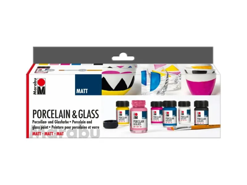 Das Set beinhaltet alles, um sofort mit der Porzellan- und Glasmalerei loslegen zu können: 6 matte Basisfarben (Sonnengelb, Rosa, Himbeere, Enzian, Schwarz und Weiß), die optimal miteinander gemischt werden können, sowie einen Universalpinsel.