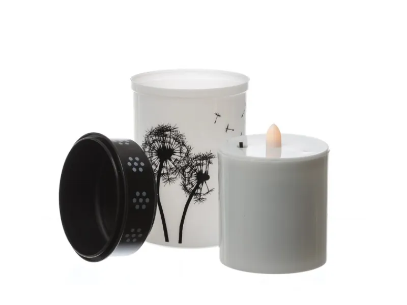 Dieses weiße LED Gedenklichter Set mit dem schwarzen Pusteblume Motiv ist ein würdiger Ersatz für herkömmliche Wachskerzen.