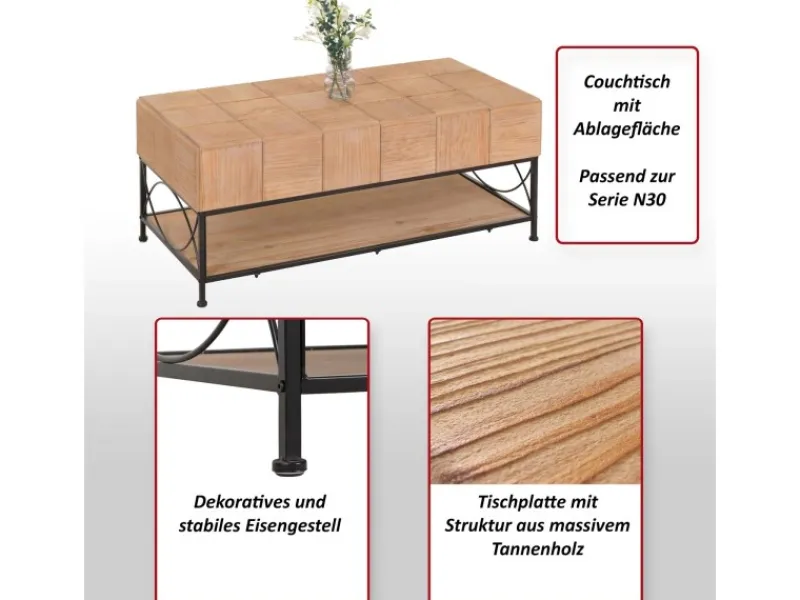Entdecken Sie den Couchtisch N30 – das Herzstück für Ihr Wohnzimmer! Mit seiner großzügigen Ablagefläche bietet dieser Tisch nicht nur Platz für Ihre Lieblingsbücher und Dekoobjekte, sondern vereint auch Funktionalität und Stil auf höchstem Niveau. Die Tischplatte mit einer einzigartigen Struktur aus hochwertigem Tannenholz verleiht Ihrem Wohnbereich eine warme und natürliche Atmosphäre, während das dekorative und gleichzeitig stabile Eisengestell für Langlebigkeit und Eleganz sorgt.
