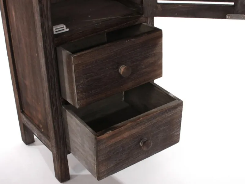 Lassen Sie sich von der lädiert anmutenden Oberfläche nicht täuschen, die Produkte dieser Serie sind qualitativ hochwertig verarbeitet und wurden nur aus den besten Materialien gefertigt. Die Holzelemente wurden hauptsächlich aus der Paulownie hergestellt, einem auch schon in Europa kultivierten Wertholzbaum, der aufgrund seiner Leichtigkeit und hohen Stabilität auch als das Aluminium der Hölzer bezeichnet wird.