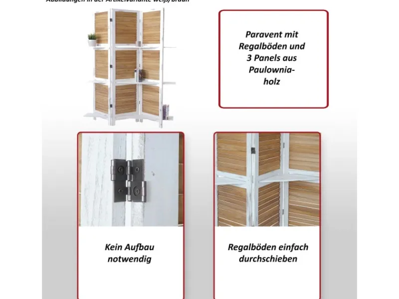 Dieser zeitlose Paravent ist ein echter Hingucker! Doch man sieht nur hin, nicht durch – wäre ja auch blöd sonst. Somit eignet er sich hervorrragend als Raumtrenner, ganz egal ob Sie ihn im Eingangsbereich, im Wohnzimmer, im Schlafzimmer oder im Kinderzimmer platzieren! Die drei Regalböden werden durch die Flügel durchgeschoben. In den so entstandenen Ecken können Bücher oder Dekoartikel gestellt werden. Das lockert die Optik auf und schafft Blickpunkte.
