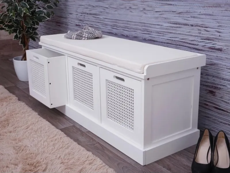 Diese praktische und schicke Garderobenbank mit drei Aufbewahrungsboxen ist ein echter Hingucker und wird jeden Raum aufwerten. Egal ob im Flur, Schlafzimmer, Kinderzimmer oder Bad, diese Sitzbank findet in nahezu jedem Wohnbereich eine vielseitige und praktische Verwendung. Sie verfügt über insgesamt drei Staufächer, welche herausnehmbar sind beliebig genutzt werden können. So findet hier jeder Schal, jeder Regenschirm, jede Einkaufstasche und noch vieles mehr seinen Platz! Die drei Holzboxen, welche genau in die unteren Staufächer passen, verleihen der Sitz-Kommode Aufgeräumtheit und Ordentlichkeit und lassen jedes Chaos verschwinden. Die Holzelemente wurden hauptsächlich aus Palowniaholz hergestellt, einem auch schon in Europa kultivierten Wertholz, das aufgrund seiner Leichtigkeit und hohen Stabilität auch als das Aluminium der Hölzer bezeichnet wird.