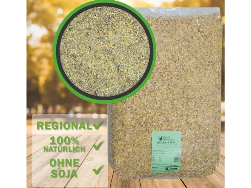 Das KÜKEN-VITAL wurde noch feiner gemahlen und mit Erbsen versehen, die essentielle Aminosäuren liefern. Auch haben wir jetzt feines Maismehl aus der Region hinzugefügt. Wie beim beliebten KÖRNER-VITAL, verzichten wir weiterhin bei unserem eigenen Kükenfutter auf den Einsatz von Zutaten, die nicht unbedingt in ein Kükenfutter reingehören.