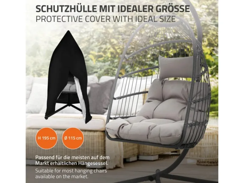 Dein Hängestuhl steht auf deine Terrasse oder in deinem Garten unter freiem Himmel? Deine Sitzkissen sind ständig feucht? Ergänze deinen Hängesessel um eine Schutzhülle. Unsere Schutzhülle ist nicht nur wasserdicht, sondern auch wetterbeständig und UV-beständig. So kannst du deinen Hängestuhl ganzjährig draußen stehen lassen. Danke dem praktischen Reißverschluss und dem 360° Kordelzug wird verhindert, dass Wasser eindringt und so deine Sitzkissen schön trocken hält. Die Schutzhülle kommt mit einer Aufbewahrungstasche zu dir nach Hause.