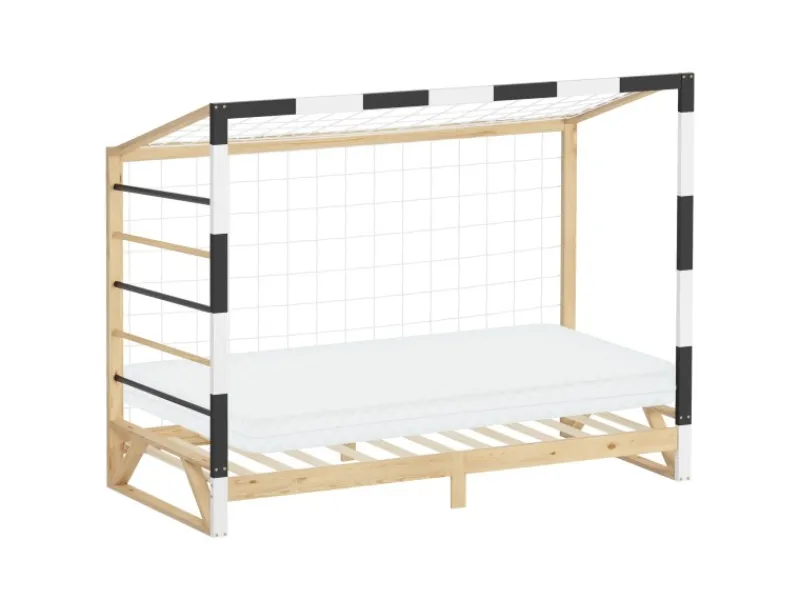 Mit diesem außergewöhnlichen Kinderbett schläfst Du nicht einfach – Du bist mittendrin im Spiel. Einfach das beiliegende Tornetz auf der Rückseite einhängen, und schon kann das Spiel beginnen. Der robuste Rahmen aus Kiefernholz hält bis zu 100 kg aus und bietet Dir sicheren Schlaf und viel Platz zum Toben.