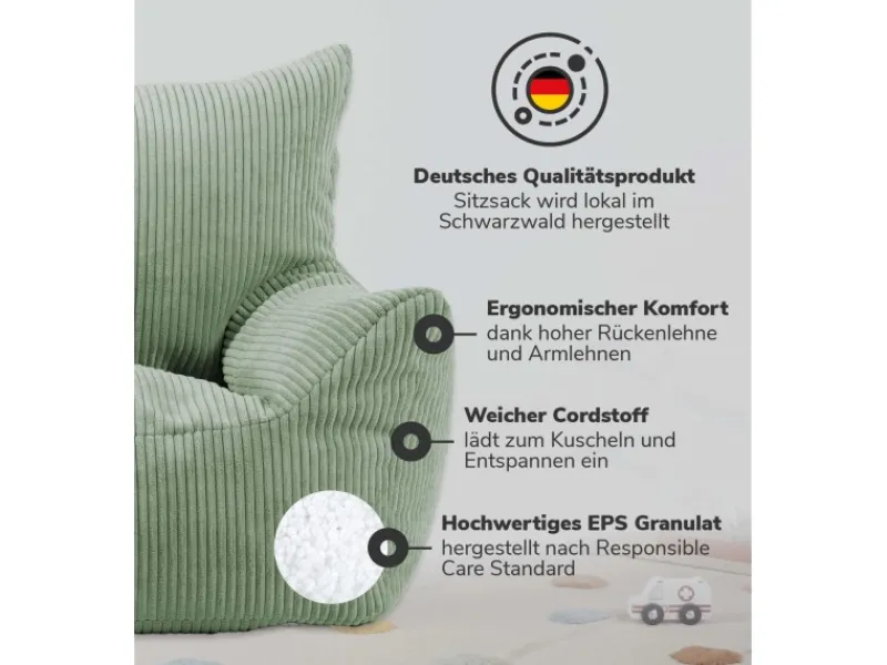 Das Produkt LIEBLINGSPLATZ-POTENZIAL! Bequem, stylisch und flauschig lädt der Kindersessel zum Lesen, Hörbuch hören, Fläzen & Entspannen ein. Damit ist ‚Der Pausenheld‘ eine tolle Erweiterung für die Spiel- und Kuschelecke im Kinderzimmer. KINDGERECHTES DESIGN! Das Sitzkissen in Sesselform passt sich dank der Füllung aus EPS Perlen ergonomisch dem Körper an. Die erhöhte Rückenlehne und große Sitzfläche sorgen für das Plus an Komfort. Ideal für Kleinkinder und Kinder von 2 bis 6 Jahren. QUALITÄTSPRODUKT AUS DE! Für die Kleinen nur das Beste. Der Beanbag wird im Schwarzwald hergestellt und hält dem Alltag mit Kindern bestens stand. Der robuste Bezug aus weichem Cord oder Webstoff trägt dein Kind wie auf Wolken. Stoffprobe erhältlich.