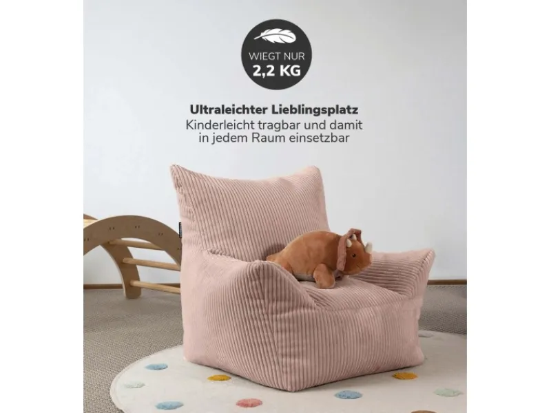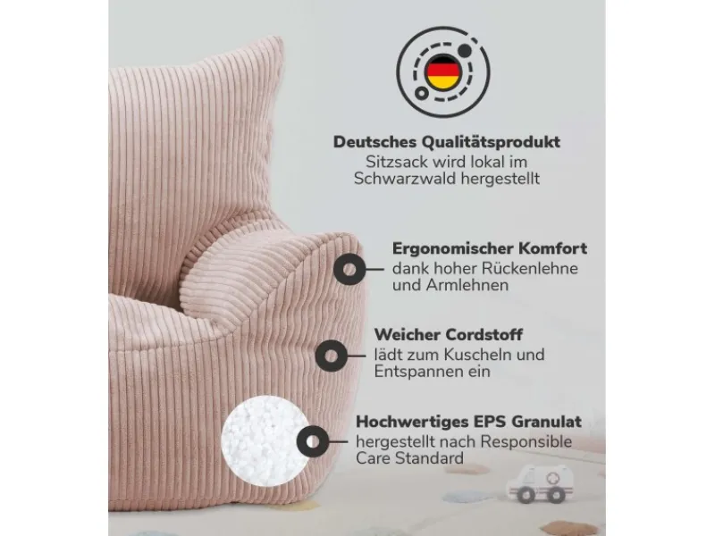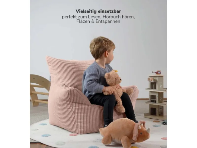 Das Produkt LIEBLINGSPLATZ-POTENZIAL! Bequem, stylisch und flauschig lädt der Kindersessel zum Lesen, Hörbuch hören, Fläzen & Entspannen ein. Damit ist ‚Der Pausenheld‘ eine tolle Erweiterung für die Spiel- und Kuschelecke im Kinderzimmer. KINDGERECHTES DESIGN! Das Sitzkissen in Sesselform passt sich dank der Füllung aus EPS Perlen ergonomisch dem Körper an. Die erhöhte Rückenlehne und große Sitzfläche sorgen für das Plus an Komfort. Ideal für Kleinkinder und Kinder von 2 bis 6 Jahren. QUALITÄTSPRODUKT AUS DE! Für die Kleinen nur das Beste. Der Beanbag wird im Schwarzwald hergestellt und hält dem Alltag mit Kindern bestens stand. Der robuste Bezug aus weichem Cord oder Webstoff trägt dein Kind wie auf Wolken. Stoffprobe erhältlich.