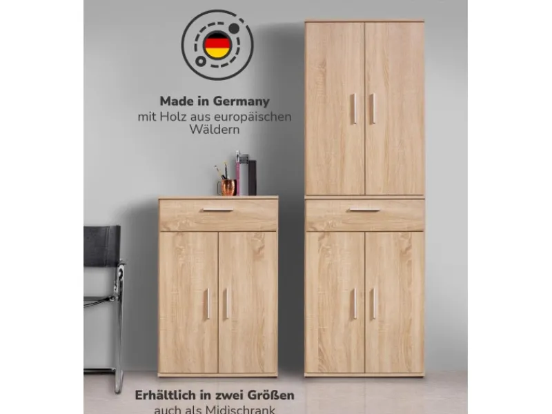 Das Produkt CLEVERER STAURAUM! Unser Schubladenschrank in 2 Größen vereint durch mehrere Fächer und Schubkasten Elemente aus Kommode & Nutzschrank miteinander, die dir viel Platz bieten. Individualisierbar mit weiteren Einlegeböden ‚Einleger‘ mit +4 Positionierungsmöglichkeiten. MADE IN GERMANY! Die Schränke werden aus Spanplatte mit beständiger Kunstharzbeschichtung & Kunststoffgriffen in NRW hergestellt. Durch die kompakten Maße dient der moderne Hoch- & Midischrank als Küchenschrank, Wäscheschrank, Büroschrank oder Allzweckschrank.