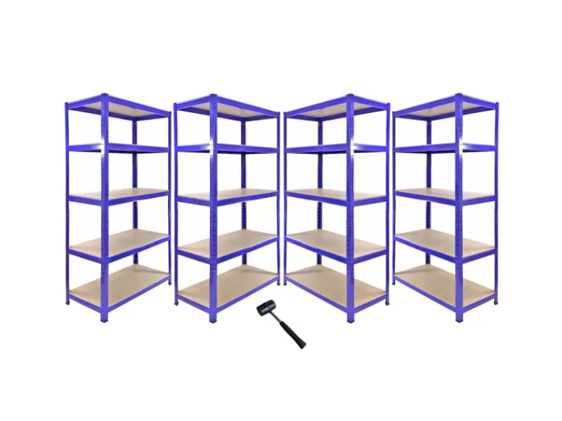 Unsere T -Rax Lagerregale sind die perfekte Lagerlösung. Diese Regaleinheiten haben eine Tragkraft von 280 kg pro Fachboden und das Eckregal 265 kg pro Fachboden. * 1 x T-Rax: 90cm L x 45cm B x 183cm H * 4 x T-Rax: 90cm L x 45cm B x 183cm H * 1,2 mm Hochleistungsstahl * 5 Regalböden * Solide MDF-Böden * Farbe: Blau * Zustand: Neu * Jedes Regal kann in zwei Hälften geteilt werden, wodurch sich zwei Werkbänke oder kleinere Regale ergeben * Gratis Gummihammer für die Montage