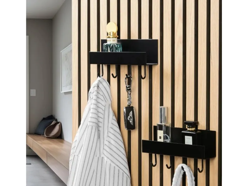 Bringe Funktionalität und Stil in deinen Flur, in Ihr Büro oder an einen anderen Ort in deinem Zuhause mit diesem praktischen Regal, das mit vier nützlichen Haken ausgestattet ist. Es ist ideal zum Aufhängen und Organisieren von Schlüsseln, Taschen oder anderen kleinen Gegenständen und optimiert gleichzeitig die Akustik im Raum mit Hilfe deiner Denpanel Akustikpanelen. Mit Abmessungen von 50 x 215 x 70 mm und einer Tragfähigkeit von 5 kg. Er ist für die einfache Montage an Denpanel Akustikpaneelen konzipiert, so dass Sie deinen Raum problemlos um eine intelligente Aufbewahrungslösung erweitern können.