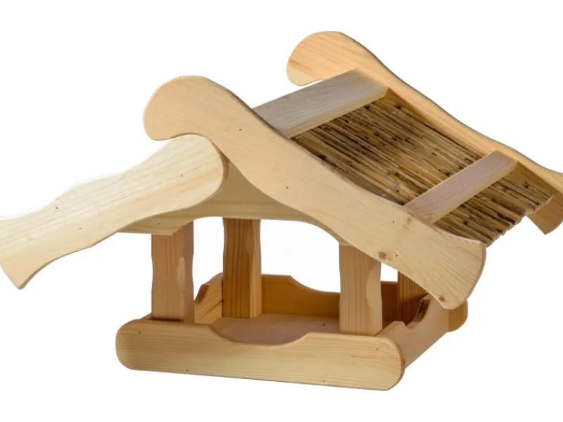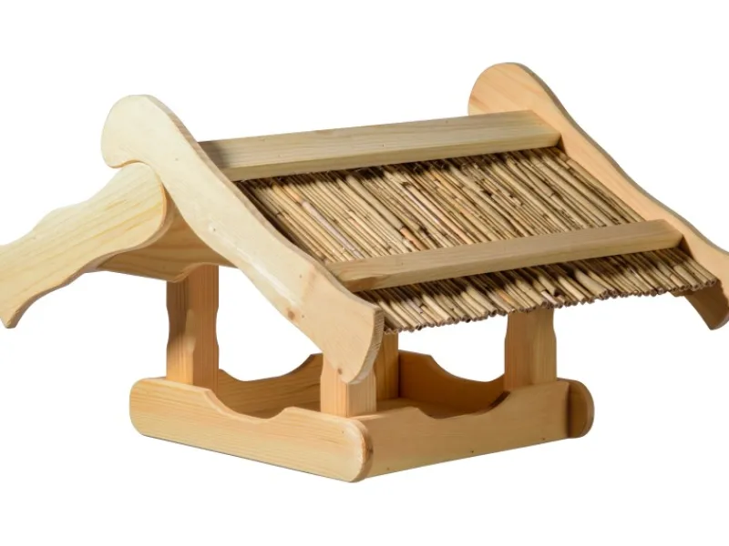 Die Futterstelle für Wildvögel wird aus hochwertigem Holz gefertigt und besticht durch seine solide Konstruktion. Das charakteristische Schilfdach verleiht dem Vogelhaus eine authentische Optik und schützt gleichzeitig das Futter vor Regen und Sonne.