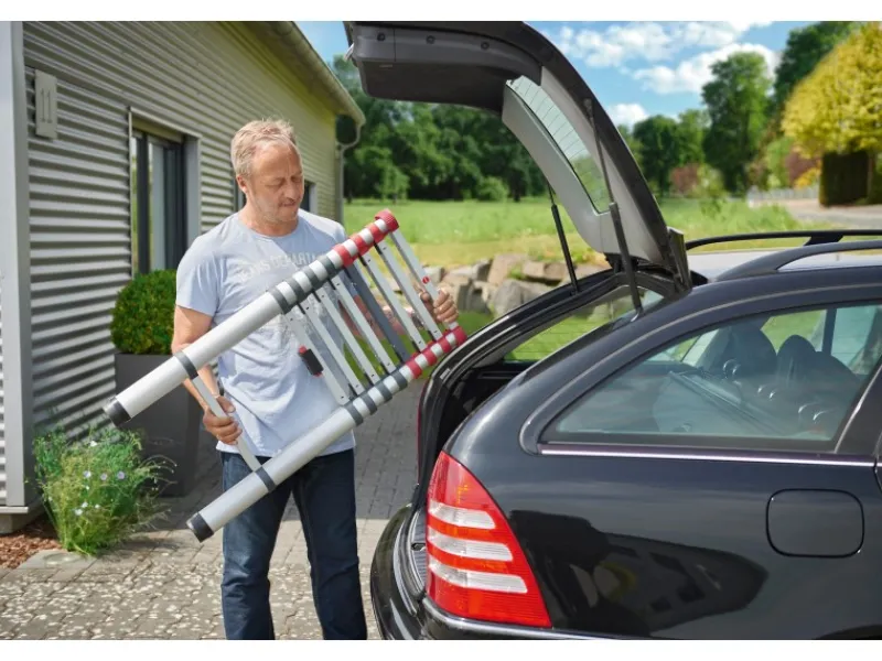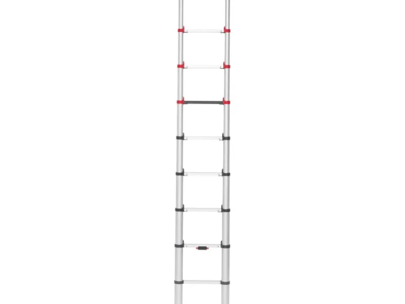 Dank des Sicherheitsabstands zwischen den Sprossen besteht keine Klemmgefahr. Zudem lässt sich der Verriegelungsstatus durch die farbige Verriegelungsanzeige an jeder Sprosse leicht erkennen. Große Kunststoff-Füße und Quertraverse, der gummierte Wandstoßschutz sowie der Transportgurt sind weitere Ausstattungsmerkmale der Hailo Alu-Teleskopleiter.