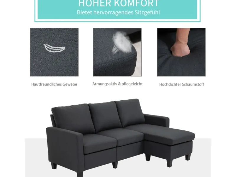 Unser HOMCOM Ecksofa ist weich gepolstert und bietet außergewöhnlichen Komfort und Entspannung. Die Couchgarnitur besteht aus einem Zweisitzer und einer Chaiselongue. Die Chaiselongue kann problemlos auf der rechten oder linken Seite platziert werden, um unterschiedlichen Raumaufteilungen gerecht zu werden.