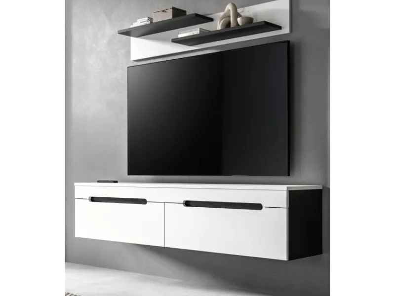 Entdecken Sie mit der kompakten Wohnwand „Cooper“ eine stilvolle Lösung, die Ihrem Wohnraum nicht nur Ordnung verleiht, sondern auch für ein harmonisches Ambiente sorgt. Die Kombination aus weißer Front und Oberboden mit basaltgrauem Korpus plus Absetzungen schafft eine zeitgemäße Optik. Die grifflosen Fronten unterstreichen das klare Design und verleihen Ihrer Einrichtung eine besondere Leichtigkeit, wobei Sie die Wohnwand ganz oder teilweise stehend als auch hängend platzieren können. „Cooper“ besteht aus zwei Teilen: einem Wandboard und einem TV-Lowboard. Mit insgesamt zwei geschlossenen Fächern sowie zwei Regalböden bietet die Wohnwand Stauraum für Ihre Lieblingsstücke, Mediengeräte und Dekorationen. Die platzsparenden Maße von 170 x 180 x 33 cm passen ideal in kleine Wohnräume.
