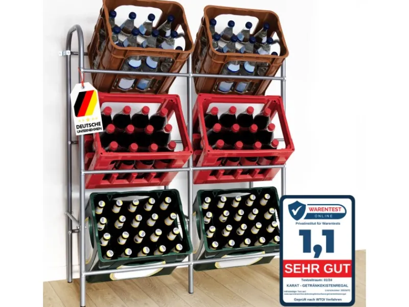 Wenn es um die Lagerung von Kisten geht, ist unser Flaschenkastenständer „Rocket“ schon zur Stelle. Als einfache und praktische Lösung für das Verstauen Ihrer Getränkekästen passt das Produkt durch sein ansprechendes Design in jeden Haushalt. Zusätzlich lassen sich auch andere Boxen mit Lebensmitteln, Dekoartikeln oder Spielzeug zwischenlagern. Erhältlich in zwei Größen entscheiden Sie ganz einfach selbst, ob Sie lieber 3 oder 6 Kästen unterbringen wollen. So bietet Ihnen das Regal auf drei Ebenen den optimalen Stauraum, den Sie beliebig nutzen können. „Rocket“ zeugt von einer besonderen Robustheit, wodurch auch beim Be- und Entladen ein sicherer Stand gewährleistet wird. Die Möglichkeit zur Befestigung an der Wand sorgt für zusätzliche Stabilität.