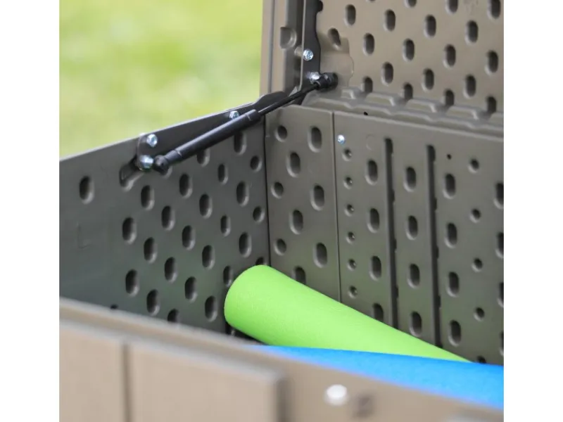 Integrierte Gasdruckdämpfer machen es besonders einfach, die Auflagenbox zu öffnen und zu schließen. Die Dämpfer halten den Deckel in einem Winkel von 90° aufrecht, sodass das Ein- oder Ausräumen einfacher gelingt. Zum Schließen drücken Sie den Deckel bequem herunter. Dank einer Vorrichtung für ein Vorhängeschloss können Sie die Gartenbox auch abschließen und wertvolle Gegenstände vor Diebstahl schützen.