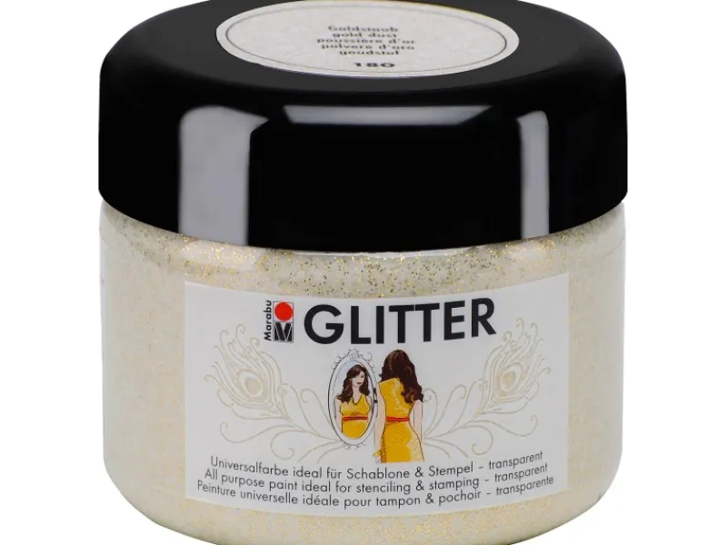 Der transparente, farblose Acryllack mit farbigen Glitterpartikeln auf Wasserbasis wurde speziell zum Schablonieren und Stempeln entwickelt. Zudem eignet sie sich auch ideal für flächige, schillernde Akzente an der Wand. Die wasserfeste und lichtechte Farbe ist für vielfältige Untergründe geeignet wie für Holz, MDF, Metall, Papier und Keilrahmen.