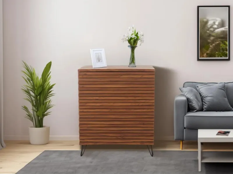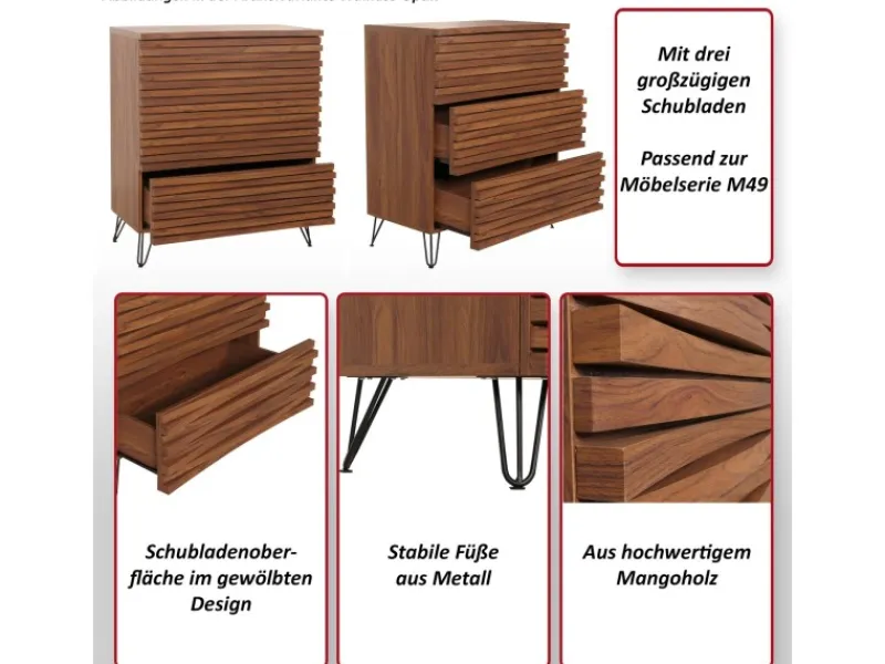 Verleihen Sie Ihrem Zuhause einen Hauch von Eleganz und Funktionalität mit unserer stilvollen Kommode aus der Möbelserie M49. Dieses meisterhaft gefertigte Stück vereint ästhetischen Charme und praktische Vielseitigkeit in einem. Teilweise gefertigt aus erstklassigem Mangoholz, das für seine Haltbarkeit und seine schöne Maserung bekannt ist, verspricht diese Kommode langanhaltende Qualität und visuelle Wärme. Die Kommode verfügt über drei großzügige Schubladen, die Ihnen reichlich Platz bieten, um Ihre Kleidung, Accessoires oder andere Haushaltsgegenstände übersichtlich zu verstauen. Das gewölbte Design der Schubladenoberflächen fügt eine elegante Dimension hinzu, die den Gesamteindruck des Möbelstücks aufwertet und es zum Blickfang in jedem Raum macht. Die robusten Metallfüße garantieren Stabilität und Standfestigkeit, während sie mit ihrem schlanken Design einen modernen Kontrast zum natürlichen Aussehen des Holzes setzen.