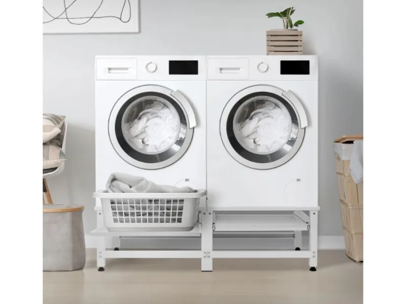 Das stabile und robuste Doppelpodest sorgt für eine Erhöhung der Position, bei allen gängigen Waschmaschinen und Trocknern. Dadurch wird das Beladen und Entnehmen der Wäsche komfortabler.