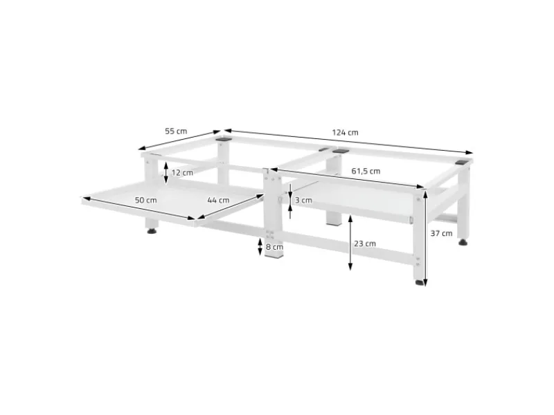 Waschmaschinenuntergestell mit ausziehbarer Ablageplatte? Kein Problem. Dieses Untergestell aus Stahl ist die optimale Erhöhung für deine Waschmaschine und Trockner. Das Stahlgestell verfügt über eine ausziehbare Platte, worauf du kleinere Dinge ablegen kannst und hast sie somit immer griffbereit. Das Gestell ist für Waschgeräte mit einer Breite bis zu 60 cm. Sollte dein Boden uneben sein, helfen dir die höhenverstellbaren Füße. Diese kannst du einfach raus oder reinschrauben und so die Höhe anpassen. Auf den vier Abstellpunkten des Rahmens befinden sich Schaumstoffpads, welche eine dämpfende Wirkung haben und so die Lautstärke der Maschinen verringert.