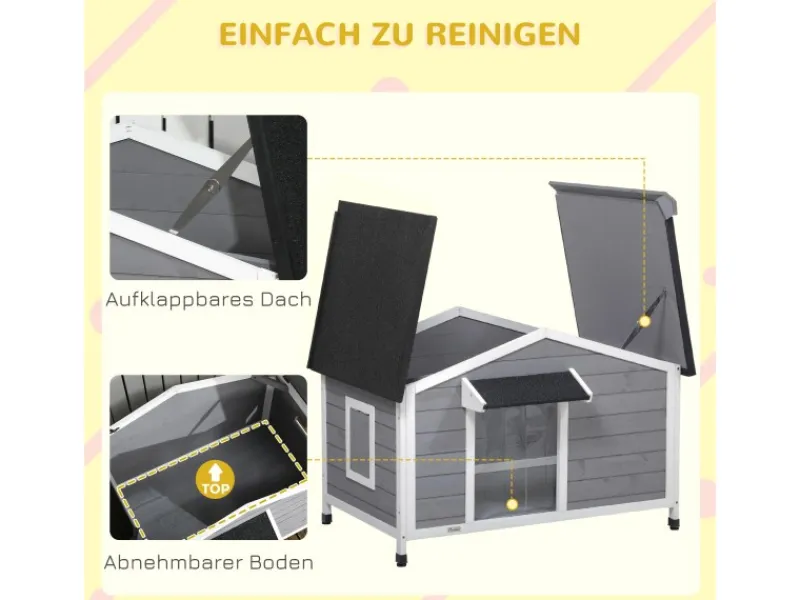 Ihr Hund wird diese PawHut-Hundehütte mit Sicherheit lieben. Das zu öffnende Dach ermöglicht es Ihnen, Ihren Hund zu streicheln, ihm einen Knochen zu geben und mit ihm zu spielen. Die Hütte verfügt über ein Wohnzimmer, in dem Ihr Haustier viel Platz zum Ausruhen hat. Die für den Außenbereich geeigneten Materialien aus Massivholz und das wasserabweisende Material sorgen für eine Qualität, die auch Regen übersteht. Das Design der Hütte hat ein niedliches Aussehen und ist stilvoll und funktional.